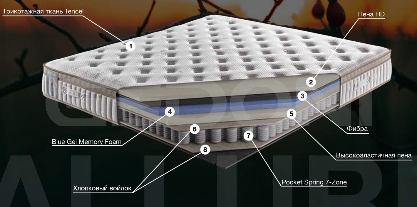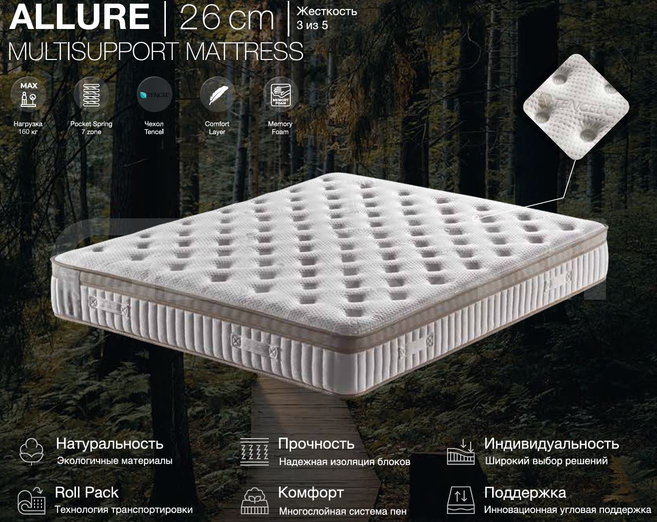 В основе матраса Allure – независимый пружинный блок Pocket Spring 7 zone, где каждая из семи зон адаптирована под разные участки тела благодаря пружинам с различной степенью упругости. Усиленные поперечные зоны равномерно распределяют нагрузку, обеспечивая оптимальную поддержку позвоночника и снижая давление на мышцы и суставы. Такая конструкция помогает сохранять правильное положение тела во время сна, создавая комфортные условия для полноценного отдыха. Дополняют матрас два слоя эластичной пены, обеспечивающие мягкость и упругость, и прочный чехол из ткани Tencel, который отличается высокой воздухопроницаемо стью и приятной текстурой.