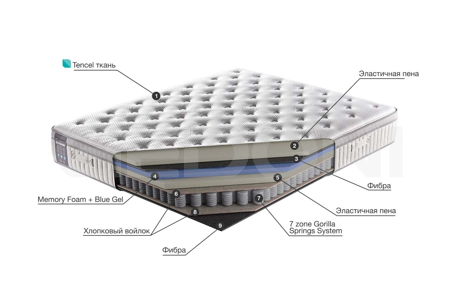 В основе матраса Elysium — блок независимых пружин Pocket Spring 7 zone. Каждая зона имеет разную степень жесткости благодаря использованию проволоки разной толщины. Блоки чередуются с усиленными поперечными зонами, учитывающими строение человеческого тела. Такой тип конструкции позволяет снять напряжение с мышц и суставов, уменьшить нагрузку на позвоночник и создать идеальные условия для комфортного отдыха и сна. Помимо пружин, матрас Elysium оснащен двумя слоями пены и несъемным чехлом из ткани Tencel.