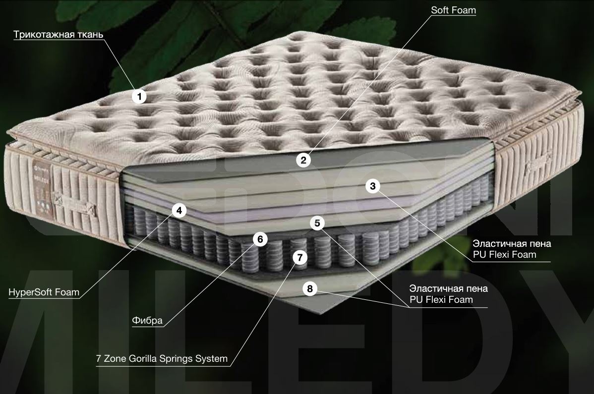 - MILEDY — матрас премиум-класса, созданный для тех, кто ценит истинный комфорт и качество. Его основа — иннова ционный пружинный блок Gorilla Springs с 7-зонной под держкой, который точно подстраивается под контуры тела и обеспечивает идеальное распределение нагрузки. Слои пены Flexi и ультрамягкой HyperSoft пены дарят ощу щение невесомости, а трикотажная ткань делает поверх ность особенно приятной на ощупь. MILEDY обеспечивает глубокий, расслабляющий сон и идеально подходит для ежедневного отдыха на высшем уровне.