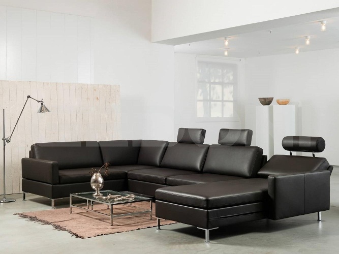 Многофункциональная угловая композиция из кресла-кушетки и двухместного дивана со строгим элегантным силуэтом подчеркивается мягкими кожаными поверхностями и филигранным хромированным каркасом.
